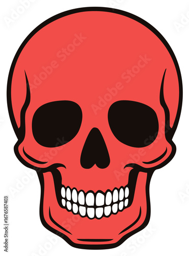 Stylized red human skull illustration with black eye sockets and teeth a danger warning symbol