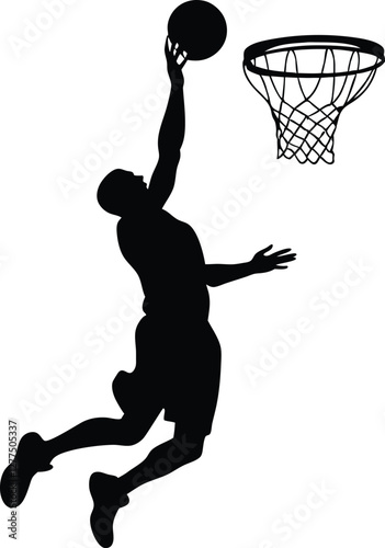 Stylized silhouette of a basketball player jumping for a dunk, captured in mid-air during a dynamic action