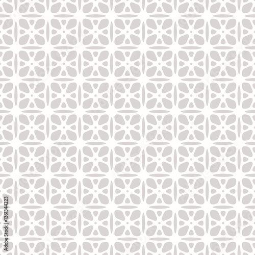 Subtle geometric seamless pattern. Simple gray and white vector floral ornament. Abstract background texture with flower silhouettes, leaves, lattice, rounded shapes, tiles. Delicate repeated design