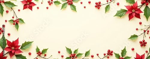 Subtle poinsettia & holly berry repeat on creamy beige, subtle, elegant