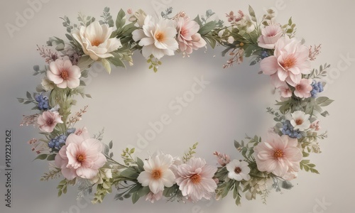 Subtle watercolor floral wreath, soft petal details , green, texture