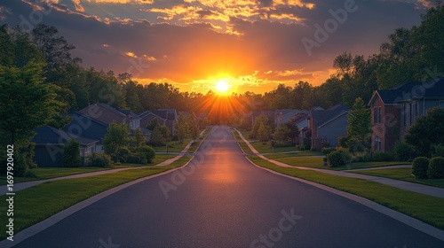 Suburban street at sunset, sunbeams
