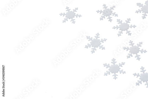 sugar paste snowflakes on white background. Christmas food, pastry. Merry Christmas and Happy New Year Holidays greeting card, frame, banner copy space, horizontal