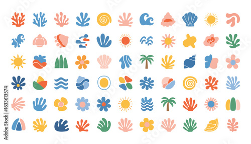 Summer collection of seaside elements vector art featuring seashells, sun, palm trees and waves
