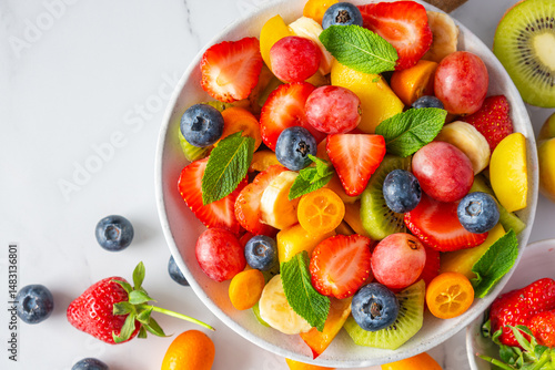 Summer colorful fruit salad in a bowl on white marble background. Top view with copy space. Healthy food for breakfast. Mixed strawberries, grapes, banana, kiwi, blueberries, peach, citrus