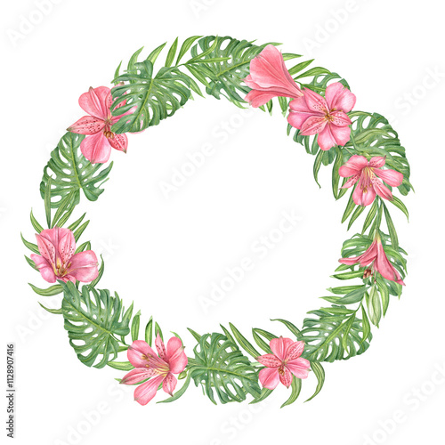 Summer exotic green leaves, pink flowers watercolor wreath with empty space for text. Alstroemeria flowers, palm, monstera foliage illustration. for textile design, greeting card, invitation