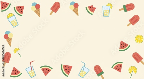 Summer Food and Drink Border with Ice Cream, Watermelon, and Juice – Blank Background Template