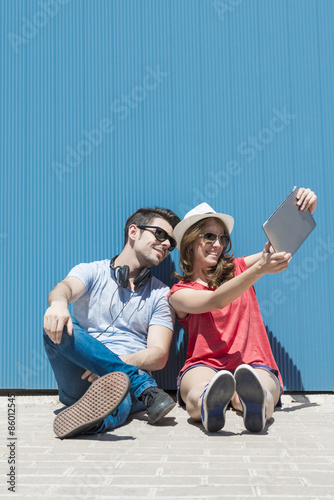 summer holidays, teenage and technology concept - couple of smil