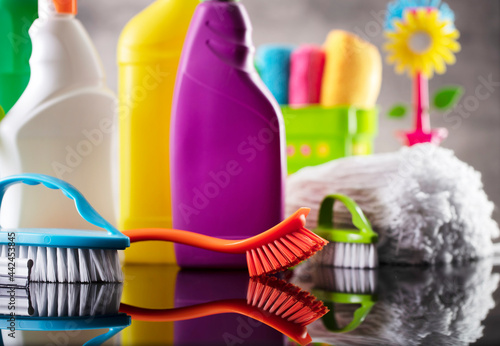 Summer house and office cleaning. Colorful set of bottles with clining liquids and colorful cleaning kit on the gray tiles background.