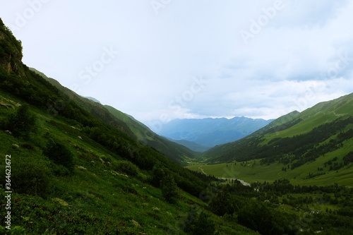 Summer mountains green grass and blue sky landscape. Caucasus mountains