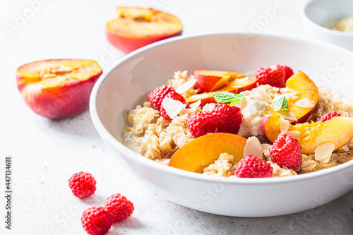 Summer oatmeal with raspberries, peaches and nuts. Healthy vegetarian food concept.