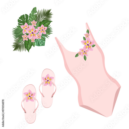 Summer set of pink swimsuit,decorated with tropical flowers,summer shoes,tropical bouquet,isolated on white background.Vector set for summer designs.