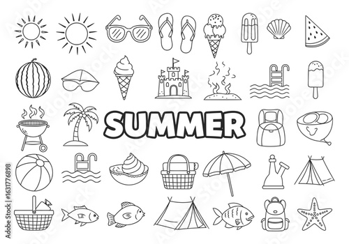 Summer Vacation Icons Set – Beach, Ice Cream, Sun, Pool, Picnic, and More for Summer Holidays, Travel, and Event Design Projects