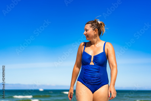 Summer vacations. Beautiful mature woman in swimsuit walking against sea background. Front view