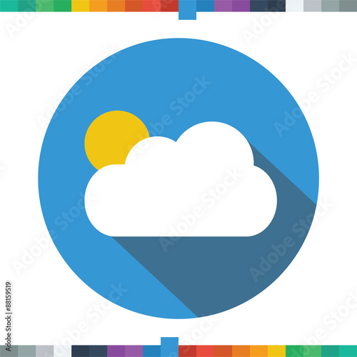 Sun and cloud flat icon in a blue circle with a long shadow.