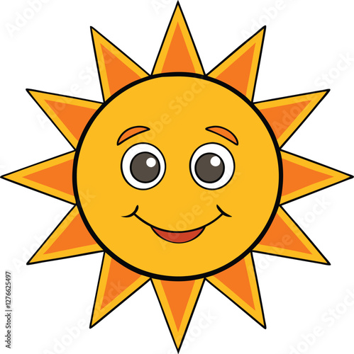 Sun cartoon smiling vector illustration, cute, happy, cheerful, summer, bright, character, sunbeam, sunny, adorable, happiness, nature, warm, energy, joyful.