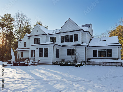 Sun goes down on snowy house - partially cleared rooftop solar panels are beginning to produce electricity again