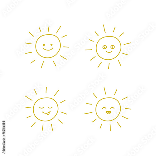 Sun icon line set, doodle hand drawn set. Sunshine and solar glow. Decorative circle sun and sunlight with happy face. Hot solar energy. Children paint. Vector illustration