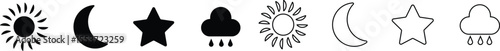 Sun, moon, cloud and star icon set isolated on transparent background. Moon sleeping, sunshine, starshine and rainy cloud. Atmosphere vector illustration. Weather symbols collection for web and app.