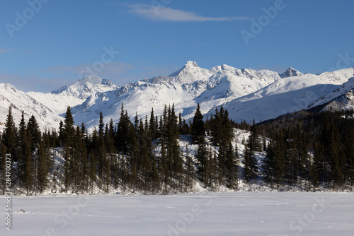 Sun shining on snowy mountains in Alaska.