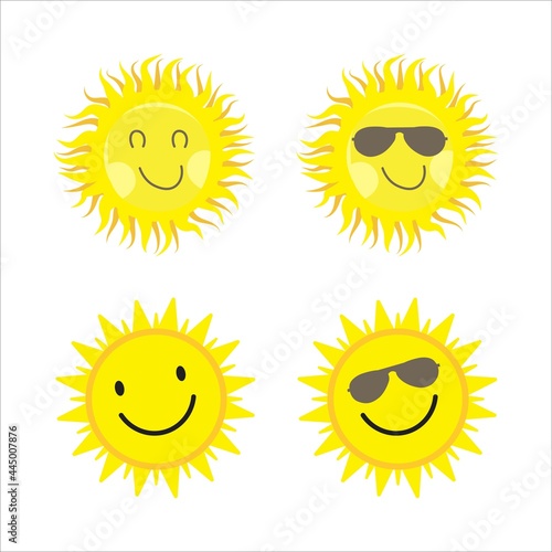 Sun sticker with a round shape and yellow color. Cute sun with smiling face and cool sunglasses. Yellow sunray coming out from sun vector design. Sun vector social media sticker collection.