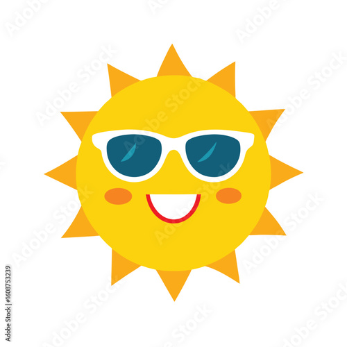 Sun with sunglasses smiling in playful summer theme shown in fun cartoon vector art