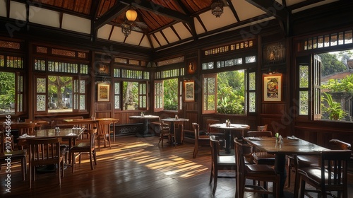 Sunbeams illuminate a rustic wooden restaurant interior with large windows and wooden tables and chairs.
