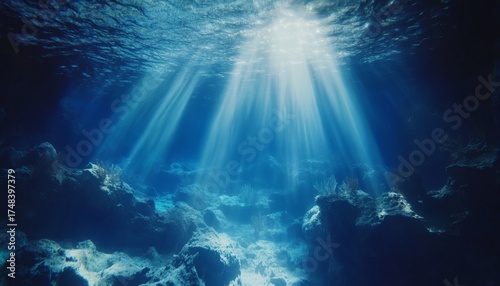 Sunbeams penetrate deep ocean water illuminating rocky seabed