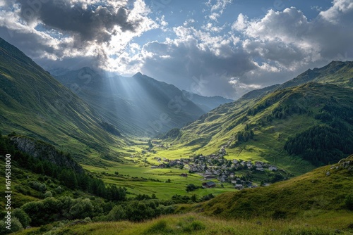 Sunbeams pierce clouds illuminating a verdant valley village nestled in mountains