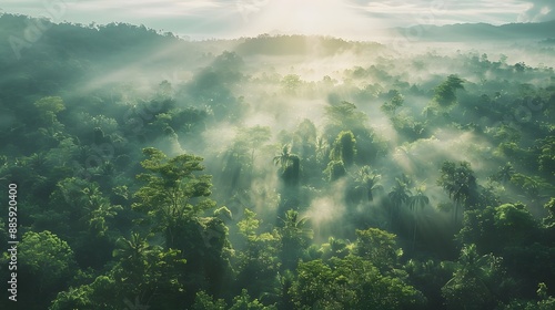 Sunbeams Through Misty Rainforest Canopy
