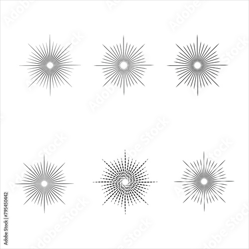 Sunburst element. Set of sunburst. Sun icons and sunbeam collection. Round sunburst, line radial frame icon set. Black sunburst on white background.