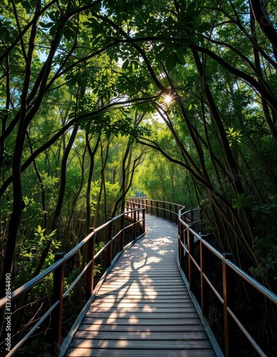 Sun-dappled wooden walkway winding through lush mangrove forest, photography, ecosystem