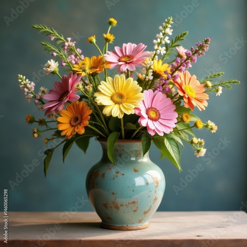 Sun-drenched wildflowers in a charming, aged vase , summer, floral