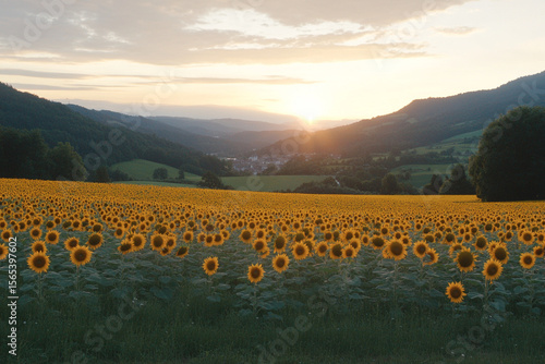 Sunflower field glowing under vibrant sunset in peaceful landscape