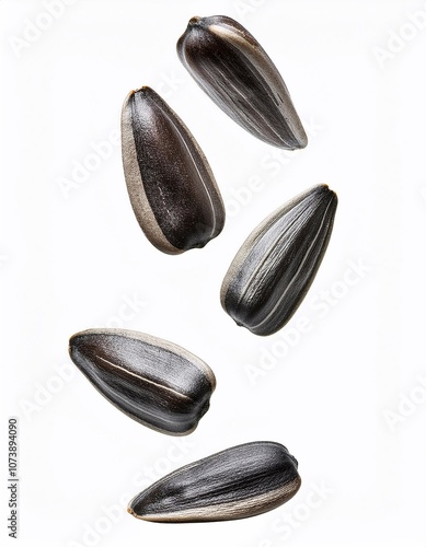 Sunflower seeds falling against white background