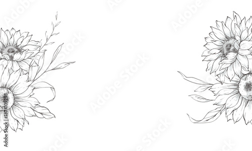 Sunflowers Line Drawing. Outline Sunflowers illustration. Hand Drawn Sunflowers background. Botanical Monochrome Floral Art. Sunflower Wedding