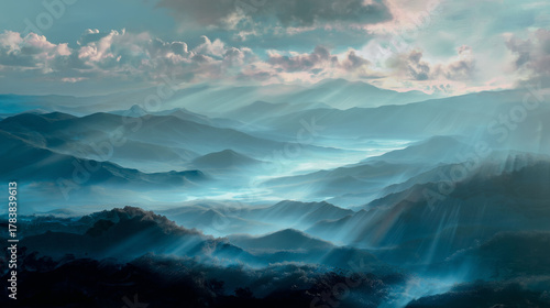 Sunlight and sunlight stream through clouds and clouds above soft mountains and mountains. Mountains and mountains are shaded with mist and mist. Light and light highlights valleys and valleys.