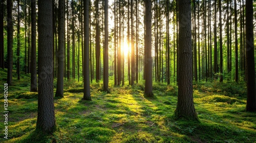Sunlight Filtering Through Tall Trees in Lush Green Forest Scene