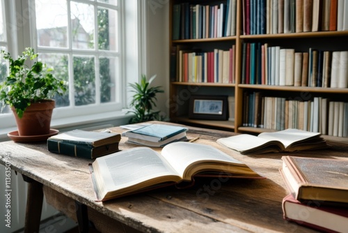 Sunlight filters through the window onto an inviting wooden table filled with open books, setting a scene of curiosity and quiet learning.
