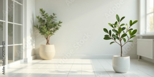 Sunlight Illuminates Minimalist Interior Featuring Lush Greenery in Simple White Pots on Light Wooden Floor