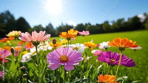 Sunlight illuminating a blooming field of flowers on a freshly cut lawn, vivid colors contrasting with the green grass, perfect for seasonal designs