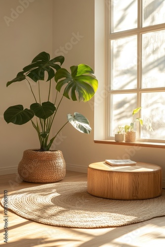 Sunlight illuminating a modern minimalist living room with jute rug and monstera plant