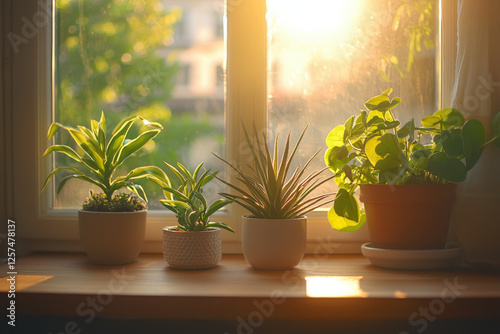 Sunlight pouring through a window highlights a collection of vibrant houseplants arranged elegantly on a wooden sill during the golden hour