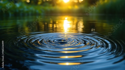 Sunlight ripples on still water, reflecting golden light. Forest edge in soft focus