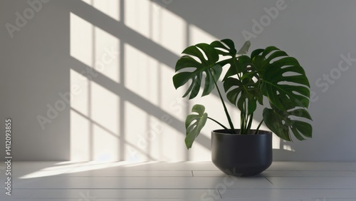 Sunlight shining on potted plant in modern interior. Plant sits near window, adding natural touch to minimalist decor.