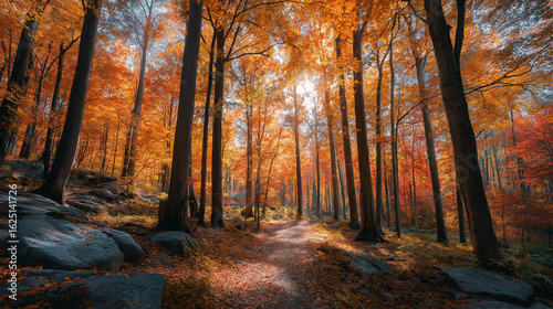 Sunlight shining through trees in an autumn colored forest, Generative Ai