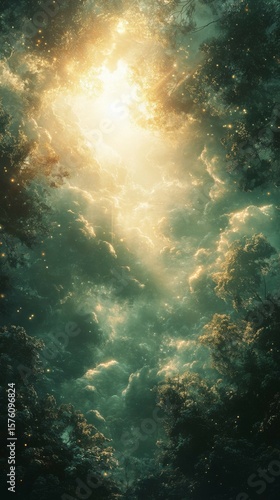 Sunlight Streaming Through Dense Woodland Canopy with Misty Clouds