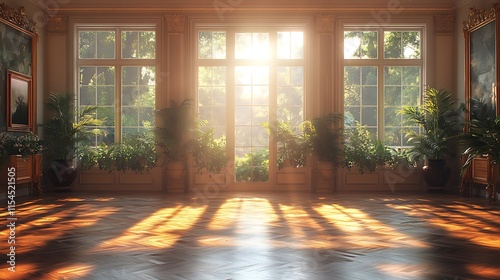 Sunlight streaming through large windows in a classic room. Concept of tranquility, elegance, and natural light.