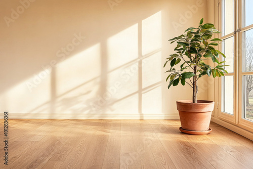 Sunlight streaming through windows onto a potted plant in a serene indoor space