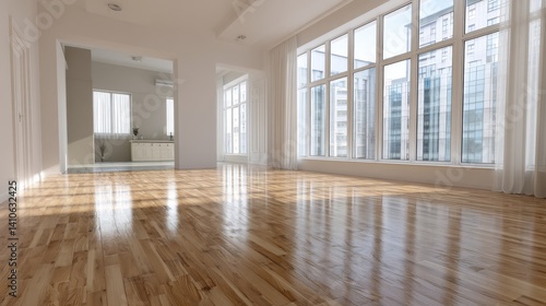 Sunlight streams into a bright, modern apartment with gleaming hardwood floors and large windows offering a city view. The space is minimalist and airy, with a clean, contemporary feel.